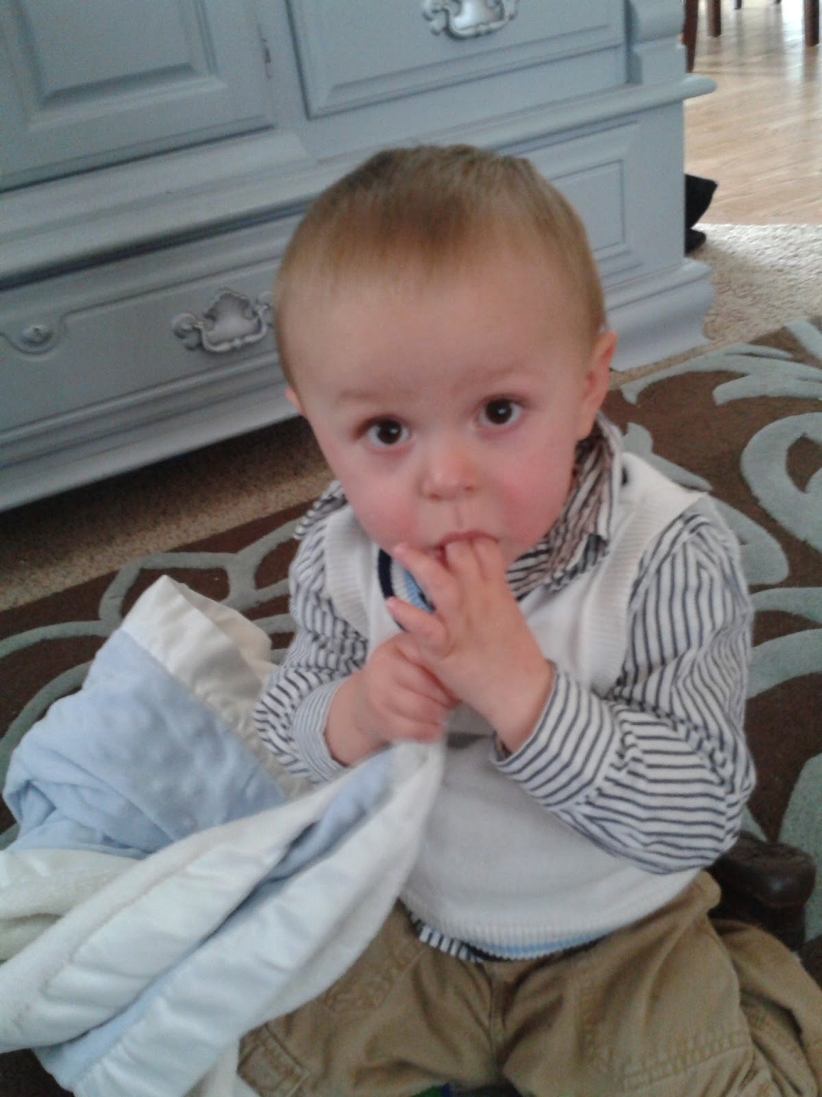 James just did his usual cute things, including walking in circles with an over-sized hat on his head, falling down, giggling, then doing it all over and over again. . . until he found his crack-laced blankie. I swear, that kid could be playing with the Parents Choice #1 toy of the year, but if his skin so much as grazes the silk edge of his blankie, that toy might as well be a tax report to this silk-addict. And he's no respecter of blankets. In public places, he outright steals other babies' blankets and lays down with them, while that baby screams to their mommy about the big 20-month old baby bully who stole their silkie!! True story! Man, i let that kid do basically whatever he wants. It's gonna be a problem some day, isn't it...